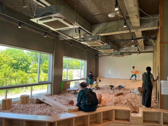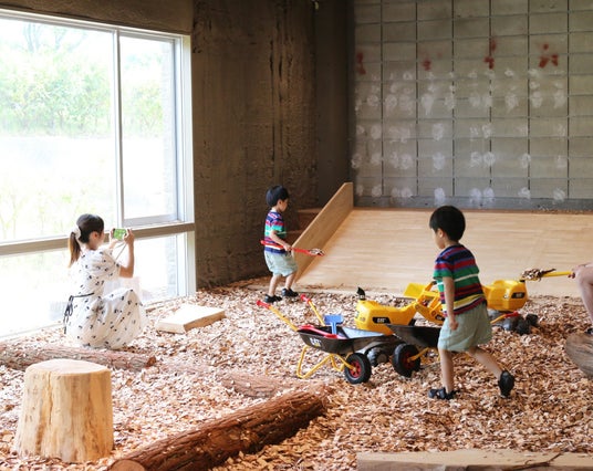 ウッドチップを敷き詰めたメインエリアには、写真映えする大きなすべり台を設置。見た目にも楽しく、お子さまの笑顔があふれる空間となっています。また、「ライブラリー」と呼ばれる個室型のアクティビティスペースでは、押入れをリノベーションした空間の中で、“のぞきこむ”という動作を通じて、さまざまな楽しみ方が体験できます。