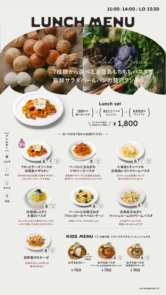 ・店内海側に併設のカフェでは、メインメニューのパスタだけでなく、淡路島産を中心とした野菜や自家製パンのビュッフェも楽しんでいただけます。また、写真映えするオリジナルドリンク等は、テイクアウト可能となっていますので、ランチタイム以外でも、ご利用いただけます。