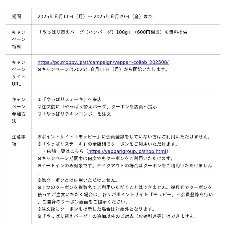 本キャンペーンでは、モッピー会員を対象に2025年8月11日(月)~2025年8月29日(金)の期間中、全国の「やっぱりステーキ」にご来店のうえ対象メニューを注文いただくと、600円相当の「やっぱり替えバーグ(ハンバーグ)」を無料で提供いたします。また、期間中はクーポンを繰り返しご利用いただけるため、ご家族やご友人とご一緒に夏休み中のお得な外食をお楽しみいただけます。