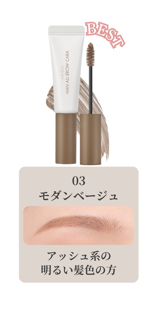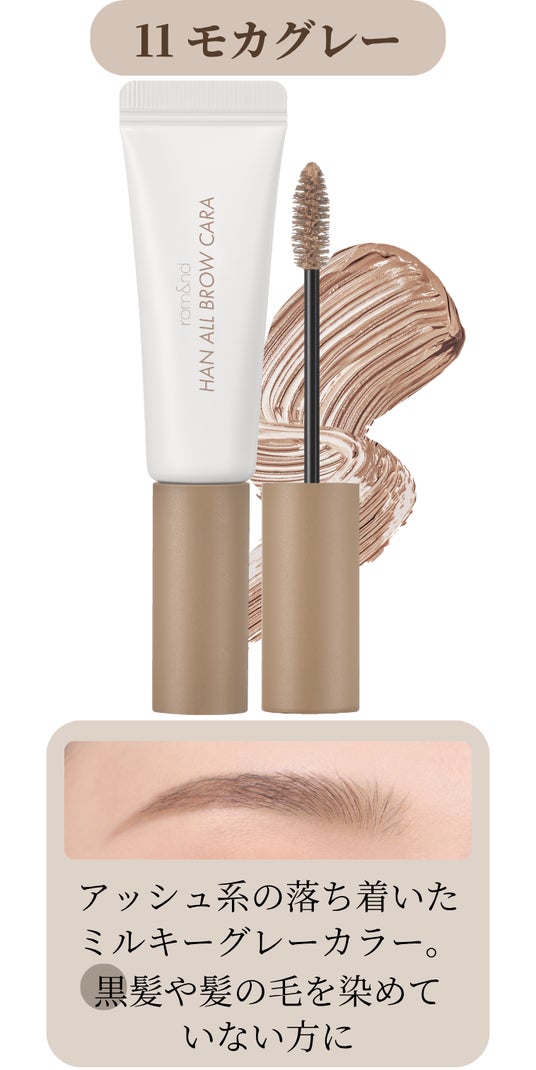 ロムアンド ハンオールブロウカラ 新色全3色 内容量:9g 価格:1,210円(税込)新登場の3色は、よりアッシュ感を効かせた絶妙なカラー展開。ひと塗りで垢抜け眉に!