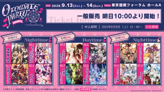 アイディアファクトリー株式会社(代表取締役社長:佐藤 嘉晃/所在地:東京都豊島区)の女性向けゲームブランド「オトメイト」は、2025年9月13日(土)・14日(日)に東京国際フォームラム ホールAにて開催する「オトメイトパーティー2025」の会場チケット一般販売が明日8月9日(土)より開始することをお知らせいたします。