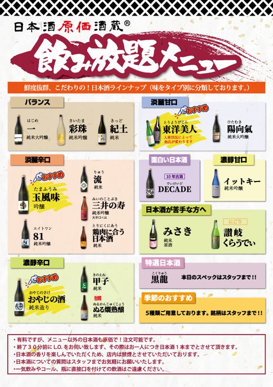 ※お1人様+¥500(税込み)で日本酒が35種となるプレミアム飲み放題へアップグレード可