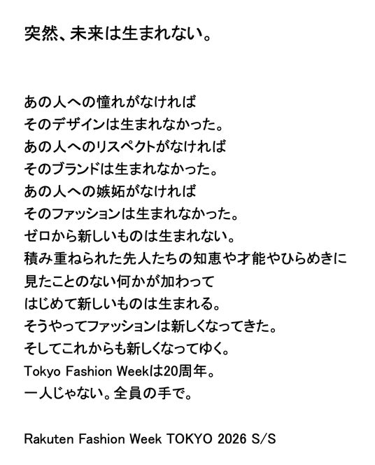 Rakuten Fashion Week TOKYO 2026 S/S 2025年9/1(月)~9/6(土)開催「世界の継ぎ目となれ - JFW 20 + 20 -」を年間テーマに新たな20年へと前進