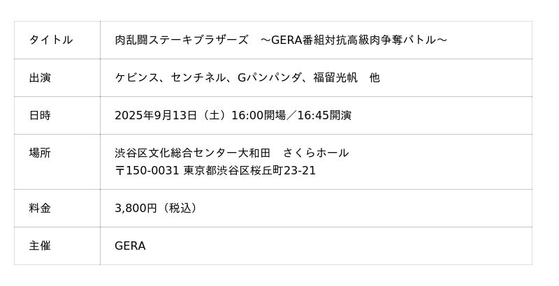 プロシューマー支援事業を展開する株式会社ファンコミュニケーションズ(本社:東京都渋谷区、代表取締役社長:二宮幸司)が運営する国内最大級のお笑いラジオアプリ「GERA」は、ひょんなことから手に入れた高級肉を賭け、各GERA番組パーソナリティが番組対抗戦で競い合うライブ『肉乱闘ステーキブラザーズ ~GERA番組対抗高級肉争奪バトル~』を開催いたします。