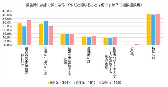 次に、「帰省時に実家で気になる・イヤだと感じること」について聞いたところ、「親の言動・価値観の押し付け」(28.6%)と「自分の生活への干渉」(28.2%)がほぼ同率で上位を占めました。また、「結婚や出産に関する話題」(14.6%)もストレスの要因となっています。