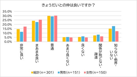 また、「きょうだいとの仲」については、「普通」(29.6%)が最多。「非常に良い」(14.3%)と「まあまあ良い」(23.9%)を合わせると38.2%で、良好な関係を築いている人も多いことがわかります。その一方で、「疎遠」(7.0%)、「良くない」(5.3%)、「あまり良くない」(5.0%)の回答も17.3%と一定数あり、兄弟姉妹の関係性も一様ではないことがうかがえます。