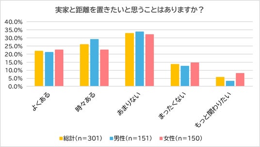 続いて、「実家と距離を置きたいと思うことはあるか?」聞いたところ、「よくある」(21.9%)、「時々ある」(25.9%)と答えた人が約半数(47.8%)に上る結果となりました。反対に、「もっと関わりたい」と答えた人は5.7%にとどまりました。