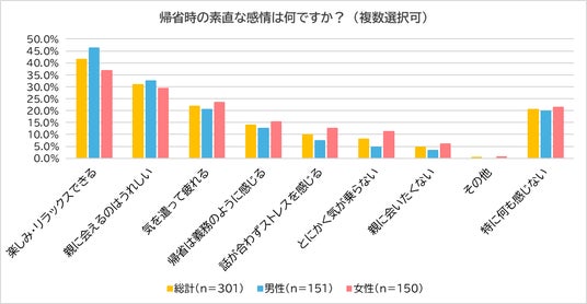 一方、「気を遣って疲れる」(21.9%)、「帰省は義務のように感じる」(14.0%)、「とにかく気が乗らない」(8.0%)、「親に会いたくない」(4.7%)といったネガティブな感情も目立ちました。また、女性は男性より「気疲れ」「義務感」「会いたくない」と答える割合が高く、帰省ブルーを抱えやすい傾向が見えました。