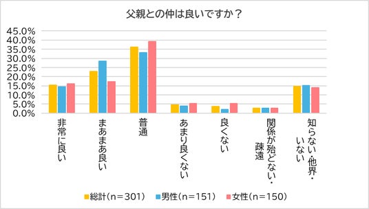 最後に「父親・母親・きょうだいとの仲」について聞きました。「父親との仲」については、「非常に良い」(15.3%)、「まあまあ良い」(22.9%)と答えた人が38.2%。「母親との仲」については、「非常に良い」(19.9%)、「まあまあ良い」(28.2%)と答えた人が48.1%で、父親との仲を約10ポイント上回りました。