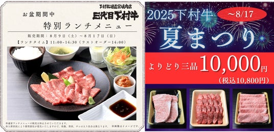 株式会社下村畜産食肉(本社:愛知県大府市、代表取締役社長:下村知士)が運営する「下村牧場直営焼肉店 三代目下村牛」では、8月9日(土)から17日(日)までのお盆期間の9日間、特別な二大お得企画を開催しています。