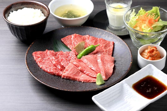 〈特上カルビ60g、特上あかみ60g、塩タン60g、サラダ、スープ、白菜キムチ、ご飯、ミニデザート〉