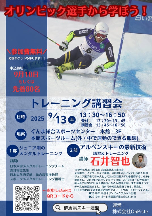 群馬県スキー連盟(所在地:群馬県前橋市、会長:林辰男)主催、株式会社OnPiste(本社:群馬県高崎市、代表取締役:住谷亮太)運営による「トレーニング講習会」を2025年9月13日(土)、群馬県総合スポーツセンターで開催します。講師には平昌オリンピック日本代表の石井智也氏、日本大学スポーツメンタルトレーニングチームの専門家を迎え、競技力向上に欠かせない「技術」と「メンタル」を総合的に学べる特別な1日です。10年以上の歴史を持つ本講習会は、今年もさらなる進化を遂げて開催されます。