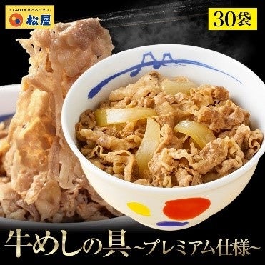 赤身と脂身のバランスのよい北米産牛肉とシャキシャキ玉ねぎをすっきりとしたタレで仕上げた、松屋一番人気の『プレミアム仕様牛めしの具』がたっぷり30食!アレンジ自在、厚さ約1cmで収納も楽々!