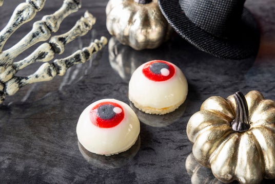 つぶらな瞳でこちらを見つめる「目玉ムース」は、その名の通りアイキャッチーなスイーツ。ミルクたっぷりのムースの中に忍ばせたフランボワーズジュレが絶妙なアクセントの、不気味で愛らしいムースです。となりに静かに佇むのは、墓地を模したグラスデザート「ブラックチェリーのヴェリーヌ 」。バニラ香るブランマンジェをベースにブラックチェリーの酸味を重ね、深く妖艶な余韻を残します。