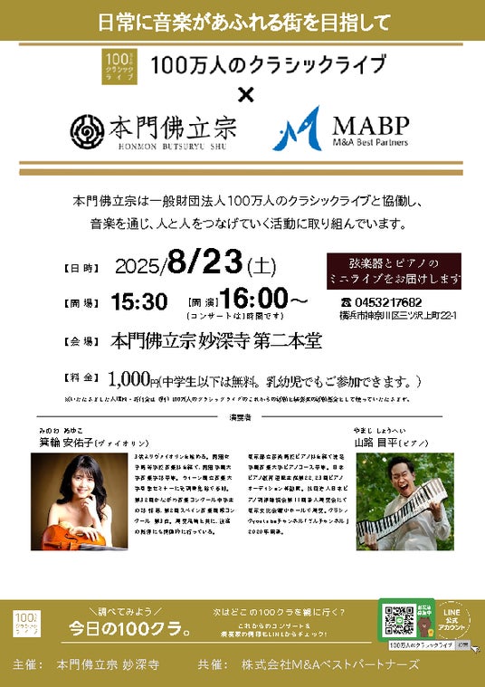 製造、建設、不動産、医療・ヘルスケア、物流、ITに特化したM&A仲介を行う株式会社M&Aベストパートナーズ(本社:東京都千代田区、代表取締役社長:齋藤 達雄 以下M&Aベストパートナーズ)と、一般財団法人100万人のクラシックライブ(東京都千代田区、代表理事:蓑田秀策 以下100万人のクラシックライブ)は、8月23日(土)16:00より、本門佛立宗 妙深寺にて、クラシックライブを開催することをお知らせいたします。