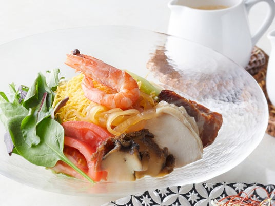 つるりと喉ごしの良い麺に、海老・チャーシュー・蒸し鶏・煮鮑など豪華な具材をたっぷりトッピング。胡麻ダレのコク、または醤油ダレのさっぱりとした味わいをお好みで選べる、夏の定番“涼味麺”です。ひと口ごとに素材の旨みが広がる、贅沢なひんやりメニューをご堪能ください。