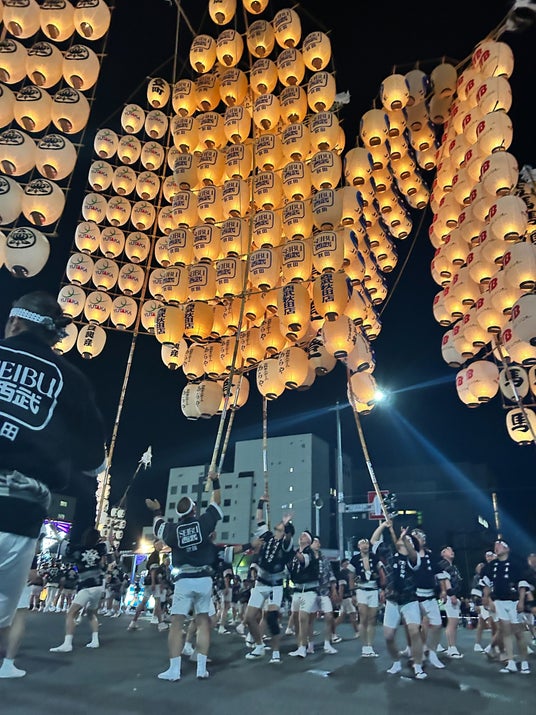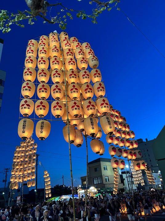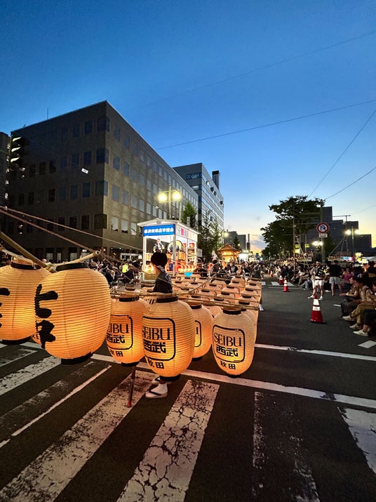 午後7時頃には夜本番が開始されました。秋田の夏空が星空に変わり始めた頃には、何百という竿燈で埋め尽くされ、竿燈会メンバーが歓声を浴びながら次々と妙技を披露し、川のように流れ、輝いていました。