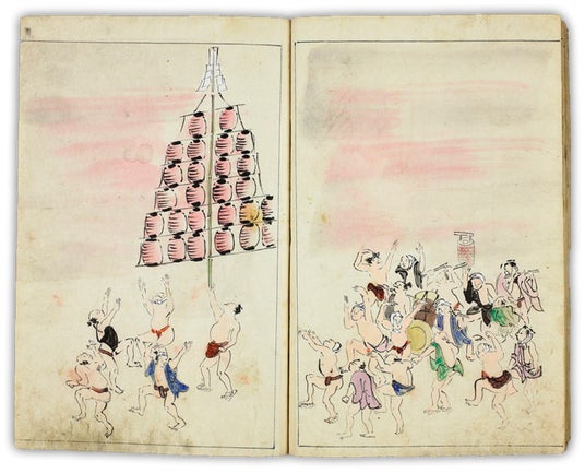 現在残っている最も古い文献は、寛政元年(1789)津村淙庵の紀行文「雪の降る道」で、陰暦の7月6日に行われたねぶり流しが紹介されています。このときには既に秋田独自の風俗として伝えられており、長い竿を十文字に構え、それに灯火を数多く付けて、太鼓を打ちながら町を練り歩き、その灯火は二丁、三丁にも及ぶ、といった竿燈の原型が記されているそうです。