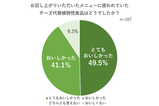 弊社が店舗利用者を対象に実施したアンケート※で「チーズがとても好き・好き」と回答した方のうち、約93%の方が『QBB これもいいキッチン』のメニューがおいしかったと回答。また、約91%の方がメニューに使用されていた「チーズ代替植物性食品」をおいしかったと評価。