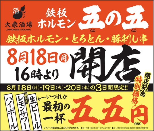 2025年8月18日(月)16:00 大衆酒場「鉄板ホルモン五の五 」が大阪十三にオープン!開店から3日間 限定ドリンクが一杯55円※