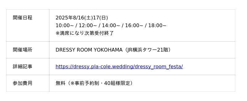 「PLACOLE & DRESSY」ブランドを展開する冒険社プラコレ(本社:神奈川県鎌倉市、代表取締役CEO:武藤功樹)は、横浜駅直結JR横浜タワー21F、ウェディングの魔法にかかる空間"DRESSY ROOM YOKOHAMA"にて、8/16(土)17(日)の2日間限定で、これから結婚式をお考えのカップル様に向けた、個室相談やウェディングドレス試着ができる豪華特典付きのウェディング初体験フェスを開催いたします。(40組様限定、無料開催)
