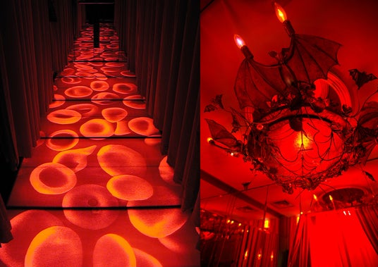 「魔除の十字架」が埋め込まれたフロントスペースに迎えられ進んでいくと、紅いベルベットのカーテンに取り囲まれ、赤血球が浮かび上がる廊下が伸びています。