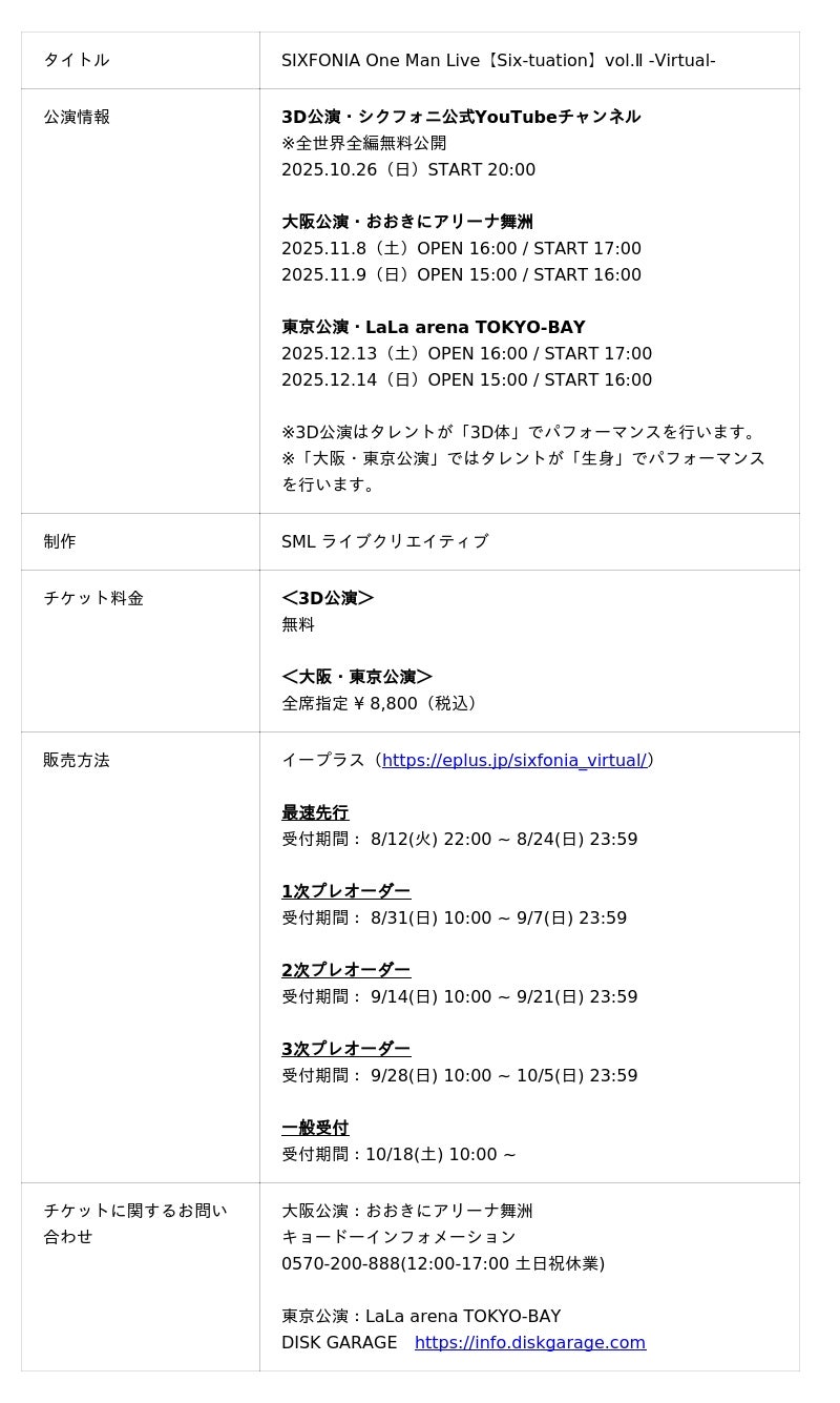 3D公演は、10月26日(日)20:00よりシクフォニ公式YouTubeチャンネルにて、全世界全編無料配信いたします。本公演では、シクフォニとしては初となる3D体を用いたパフォーマンスに挑戦し、仮想空間だからこそ表現できる映像演出や、音楽との融合による没入型ライブ体験を実現し、視聴者は画面越しでもステージの熱量をリアルに感じていただけます。シクフォニのメンバーたちが3Dの姿で繰り広げるステージは、まるで2次元と現実が交錯するような、まさに“2.5次元の最前線”を体現する内容となっております。