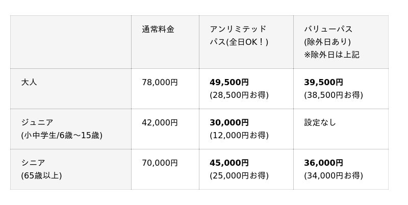 □アンリミテッドパス 営業期間中、全日利用可能・除外日無し
