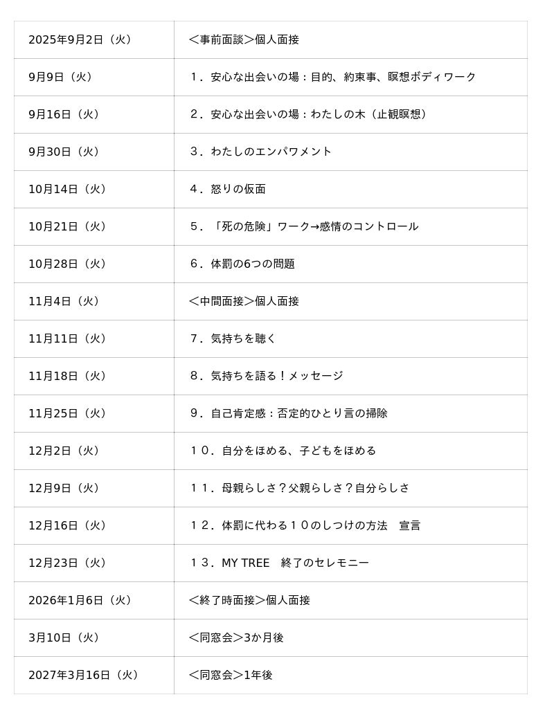 社会福祉法人 子供の家 ゆずりは(東京都国分寺市、所長:高橋亜美)は、2025年9月9日(火)より、虐待に至る親を対象とした支援プログラム「MY TREE ペアレンツ・プログラム(R)」(母親向け)を開催します。なお、プログラムに先立ち、9月2日(火)から事前の個別面接を行います。