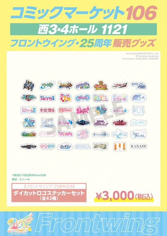 1つ目は、フロントウイングのゲーム作品のロゴを使った「ダイカットロゴステッカーセット(全42種)」