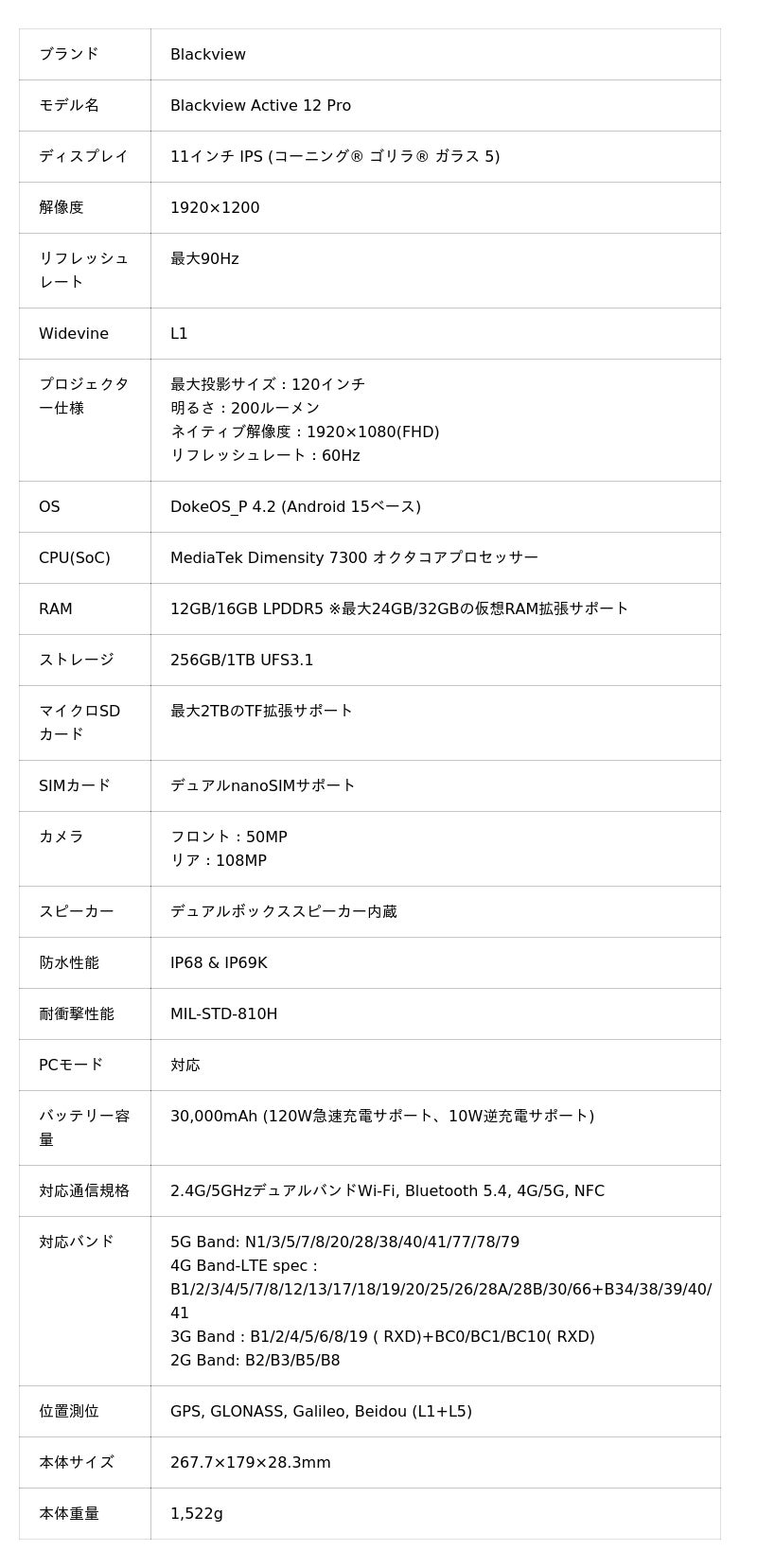 Blackview Active 12 Proの仕様一覧