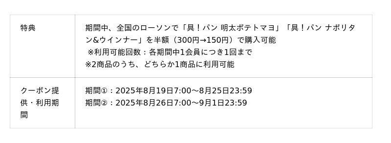 KDDIは2025年8月19日、約1,500万人が利用しているおトクなサブスクリプションサービス「Pontaパス」とローソンのコラボ商品として、オリジナル商品「具!パン 明太ポテトマヨ」「具!パン ナポリタン&ウインナー」を全国のローソン(ナチュラルローソン、ローソンストア100を除く)で発売します。Pontaパス会員限定の特典として、「ウィークリーLAWSON」の割引クーポンをご利用いただくと、半額(300円→150円)で購入いただけます。