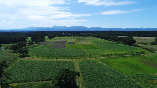 総面積約100haの東北牧場。約10haの農地で行われる無農薬・無化学肥料栽培の野菜を使用。