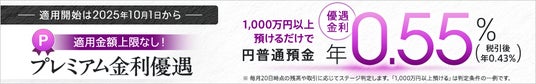 円普通預金金利がネット銀行最高水準の年0.55%(税引前)「プレミアム金利優遇」を2025年10月1日より提供開始