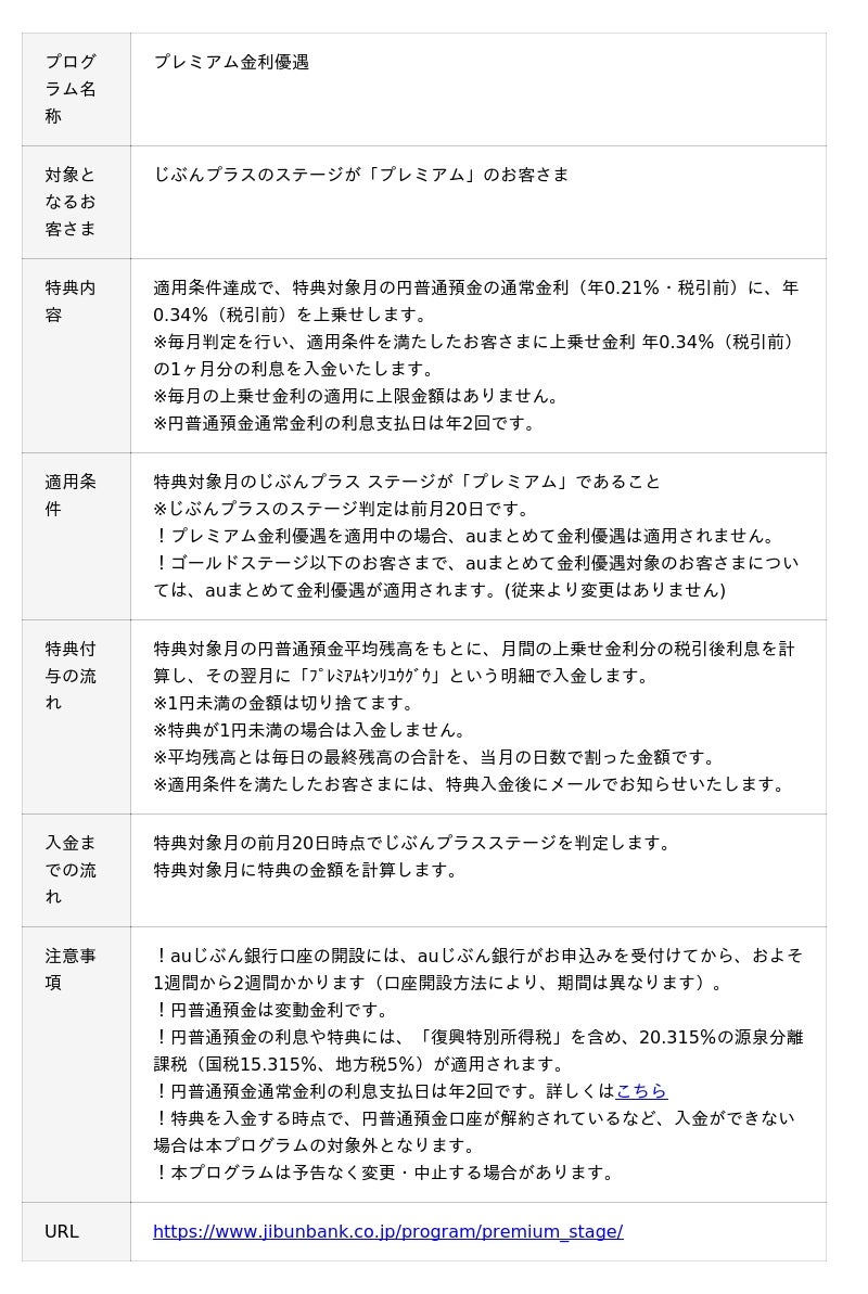 auじぶん銀行株式会社(本社:東京都中央区、代表取締役社長:田中 健二、以下 auじぶん銀行)は2025年10月1日から、「じぶんプラス」の最上位である“プレミアムステージ”に該当するお客さまを対象に、円普通預金の金利優遇プログラム「プレミアム金利優遇」(以下 本プログラム)を開始します。