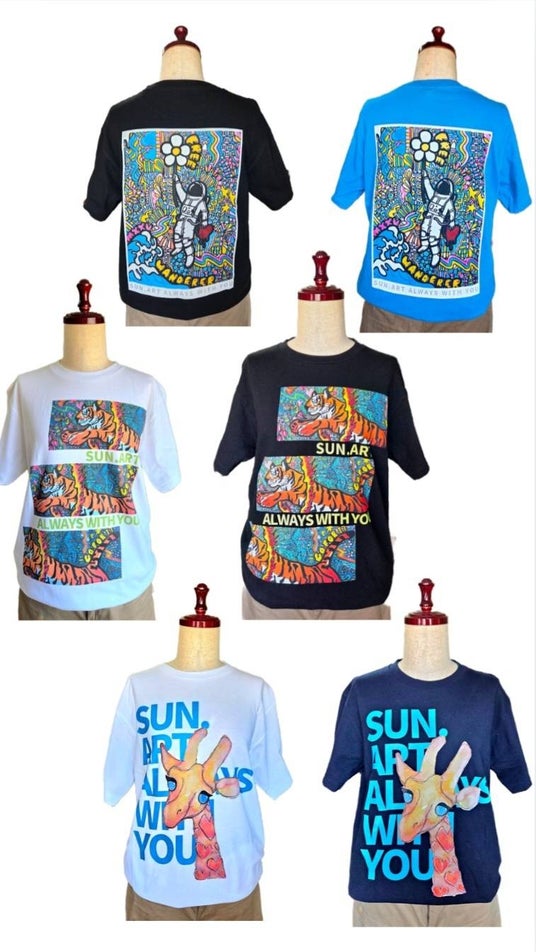 Tシャツ、ポストカード、ブローチなど、SUN氏の作品世界を気軽に楽しめるオリジナルグッズも販売いたします。