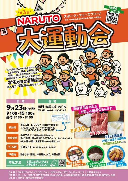 今年も仲間同士や地域間の交流を促進し、地域の賑わいを図ることを目的に、スポーツを楽しみながら防災も学べるNARUTO大運動会を開催します。