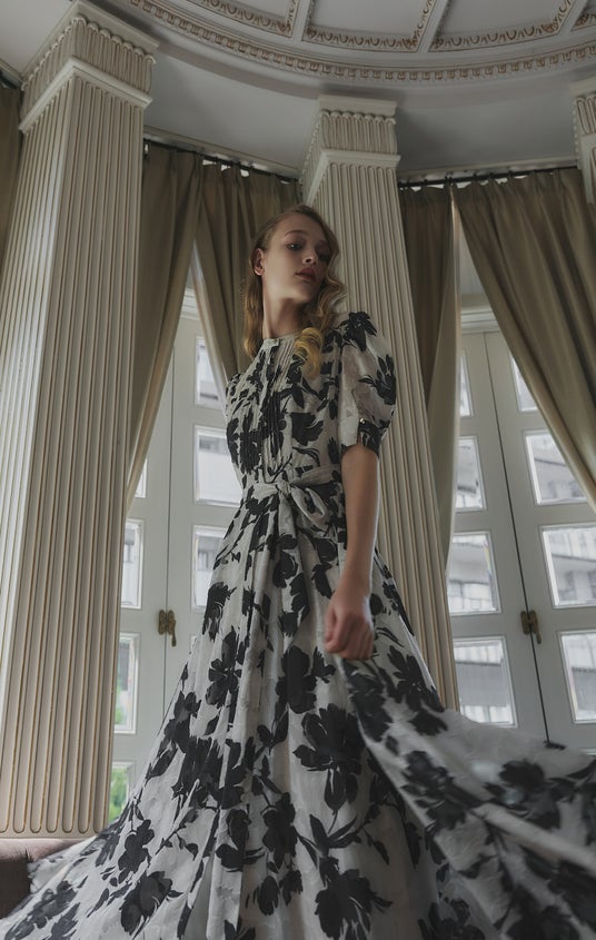 初のコレクションとなる<Vol.1>では、イタリア・プラトー産のツイード素材を使用したジャケットや、貴重な三重織の日本素材を使用したドレス、Her lip toを象徴するフローラルドレスなど9型を展開。素材の品格と優美なシルエットで特別な日にもふさわしい一着が揃います。