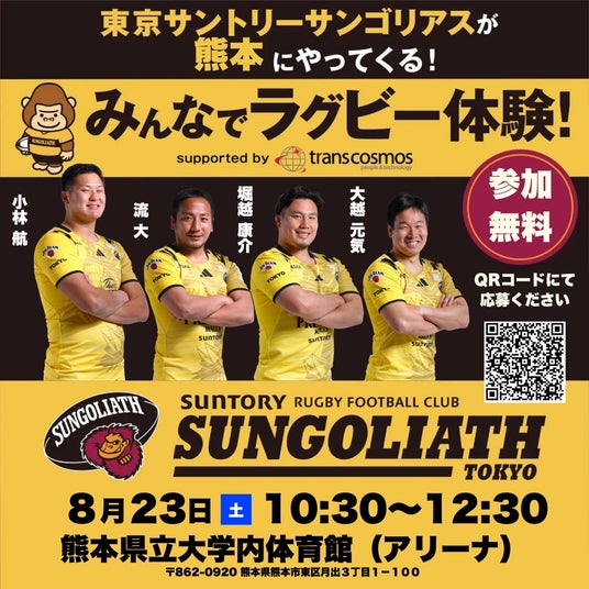 東京サントリーサンゴリアスは、熊本県立大学体育館(アリーナ)で「熊本ラグビー体験会 supported by トランスコスモス株式会社」を開催します。対象は小学生から中学生、およびその保護者で、初心者の方も大歓迎の無料イベントです。