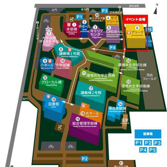当日は大学の門は開いておりますので、大学内の駐車場をご利用ください。満車の場合は周辺のコインパーキングをご拡張ください。
