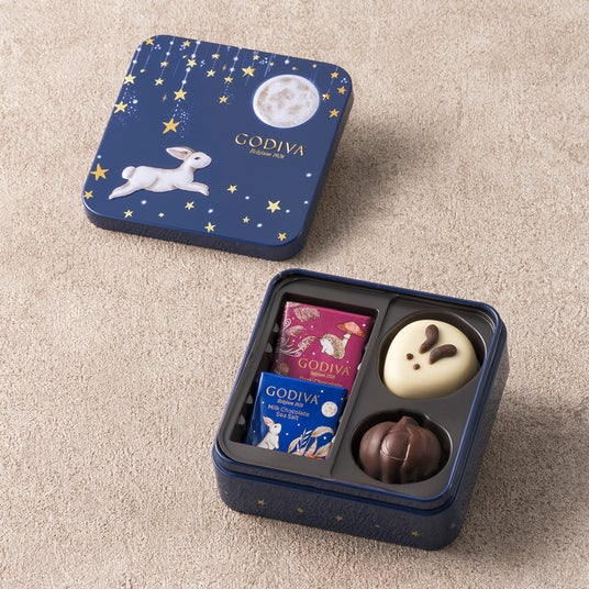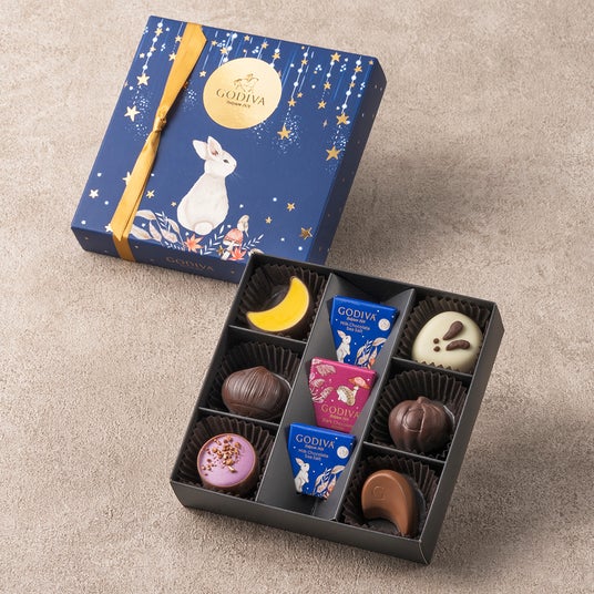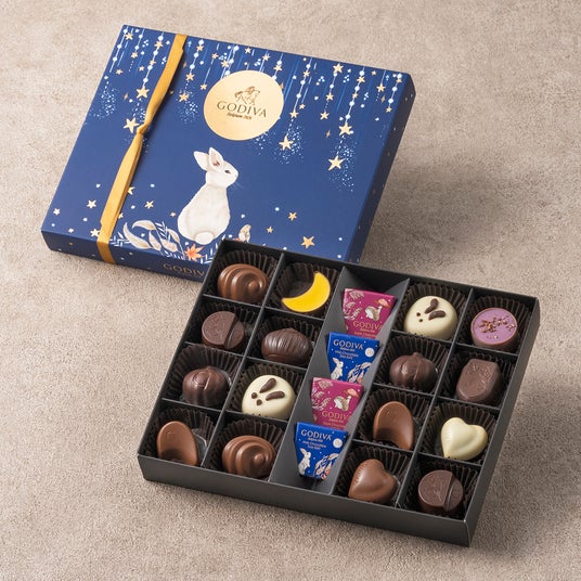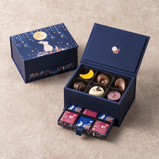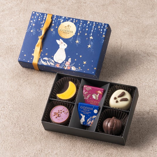 澄んだ夜空に浮かぶ満月を見ながら、秋の夜長をウサギと一緒にチョコレートを楽しみませんか。お月見を楽しむウサギを描いたパッケージは季節のご挨拶の贈り物としてもぴったりです。
