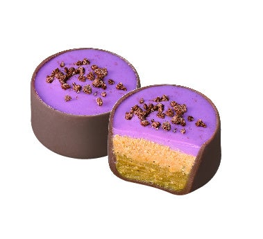 スイートポテト クレームブリュレほんのり塩味を効かせたスイートポテトのムースと、スイートポテト味のクレームブリュレをイメージしたスイートポテトバニラガナッシュをミルクチョコレートで包み、お芋色のチョコレートとココアクランブルでデコレーションしました。