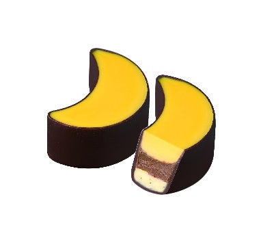 イエロームーンバニラ香るホワイトクッキークランブルムースと香ばしいアーモンドプラリネを重ね、月の形のダークチョコレートで包みました。