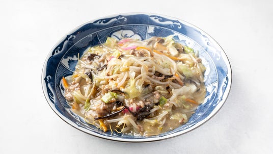 富士山のような山型に集められたあげ麺から雪崩のようなあっつあつのあんかけが流れ落ち、