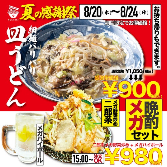 【夏の感謝祭2025】福岡ちゃんぽんの老舗「ちゃんぽん亭コシキ」日頃の感謝を込めて、創業から店舗を支える人気メニュー「皿うどん」が衝撃の900円!さらに超お得メガサイズのせんべろセット販売開始!