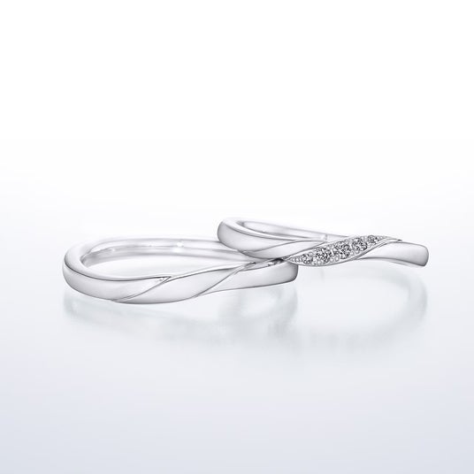 ピュアなダイヤモンドが一層輝くように美しい曲線を描くエンゲージリングと、日常使いしやすいようにメレダイヤモンドがセッティングされたマリッジリング(中央)が隙間なく繋がります。重ねて着けることで増す輝きから、おふたりの幸せの煌めきがどこまでも広がっていく様子を想像させるセットリングです。