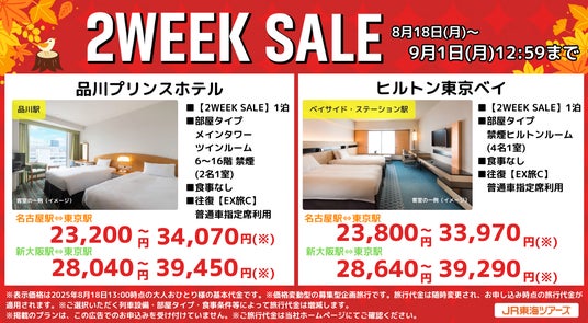 株式会社ジェイアール東海ツアーズ(本社:東京都中央区、以下JR東海ツアーズ)は、2025年8月18日(月)13時から9月1日(月)12時59分までの14日間限定で、大人気企画「2WEEK SALE」を開催いたします。今回のセールは、2025年10月1日(水)出発から2026年1月4日(日)帰着分が対象です。一度は泊まってみたい憧れホテルから日常使いに最適なコスパ抜群のホテルまで、期間限定の特別価格でご予約いただけます。紅葉が見ごろで快適なシーズンに、美しい景色や秋の味覚を満喫しに出掛けませんか。