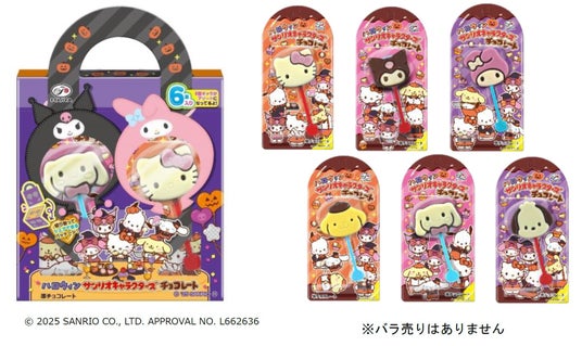 ・株式会社サンリオの人気キャラクター、ハローキティ、クロミ、マイメロディ、ポムポムプリン、シナモロール、ポチャッコ、の顔をかたどった可愛い棒付きチョコレート「サンリオキャラクターズチョコレート」からハロウィン限定デザインのアソートが登場