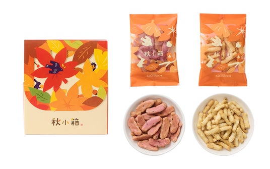 『秋小箱』は、秋に旬を迎える「さつまいも」と「ごぼう」をモチーフにした2種類の創作米菓が楽しめる季節限定の詰め合わせです。国産もち米を使用し、素材の持ち味を活かして丁寧に仕上げました。