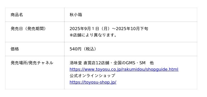 とよす株式会社(本社:大阪府池田市 社長:眞田 昌彦)は、『とよす洛味堂 秋小箱』を、2025年9月1日(月)から期間限定で発売いたします。